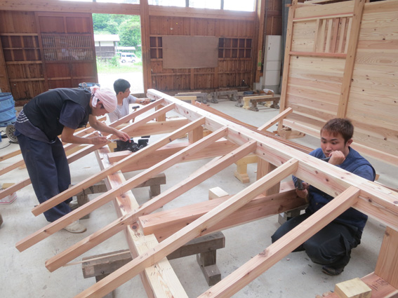 5月より、校内にて部材の墨付・加工、ガーデンシェッドの仮組みを行い、6月下旬に現場にて建方実習を行っています。