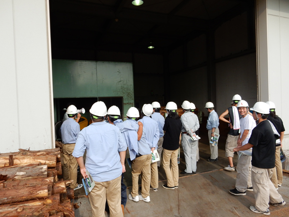 間伐材等の小径木を丸棒加工し、さらに防腐剤を加圧注入して、土木用・庭園用・建築用部材が生産される状況を学びました。